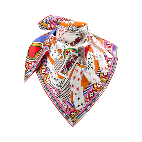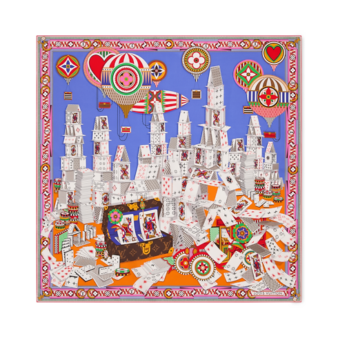 Styled in plush silk, the LV Card Game square expresses the carefree spirit of childhood and games. Its colorful print combines a castle of playing cards with evocations of travel: a Louis Vuitton trunk, hot air balloons, an antique automobile… Perfect for admirers of intricately designed silk squares, whether worn around the neck or displayed on a wall.