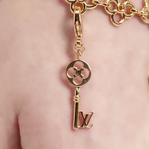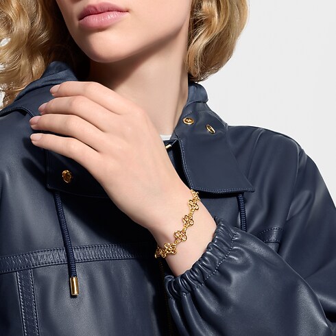 Crafted in radiant gold-colored metal, the LV Charms bracelet allows each wearer to create her own personalized look. Elegant on its own, its Monogram Flower chain can be used to clip on charms from the Louis Vuitton Fancy Accessories range. The result is a unique, eye-catching bracelet, and an original way to wear the House’s iconic signatures.