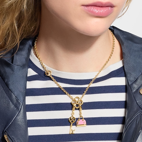 The original design of the LV Charms necklace pays tribute to the House’s iconic signatures with a spirit of playful elegance. Its delicate gold-colored chain features Monogram Flower and LV Circle links specially created to hold clip-on charms from the Louis Vuitton Fancy Accessories range. Each wearer can create her own personalized combination, resulting in a unique, eye-catching necklace.