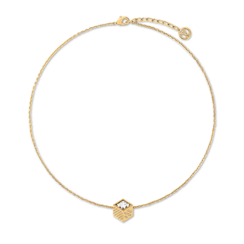 A puzzle game called Pateki, invented by Gaston Vuitton in 1932, gets a contemporary update in the playful design of the LV Cube necklace. Its centerpiece is a gold-colored metal cube with Damier canvas-style engraving, accented with a radiant rhinestone. A Louis Vuitton Paris signature adds an extra House flourish to this fun, enchanting necklace.