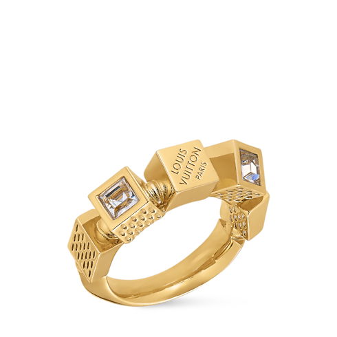 The eye-catching angular forms of the LV Cube ring were inspired by Pateki, a puzzle game invented by Gaston Vuitton in 1932. Its gold-colored metal band holds an array of cubes reminiscent of the historic Damier canvas, engraved with delicate stripes and the Louis Vuitton Paris signature. Resplendent rhinestones add a glamorous touch of sparkle to this enchanting ring.