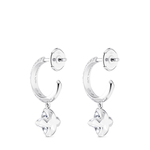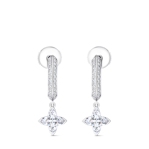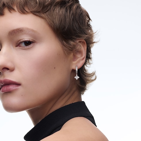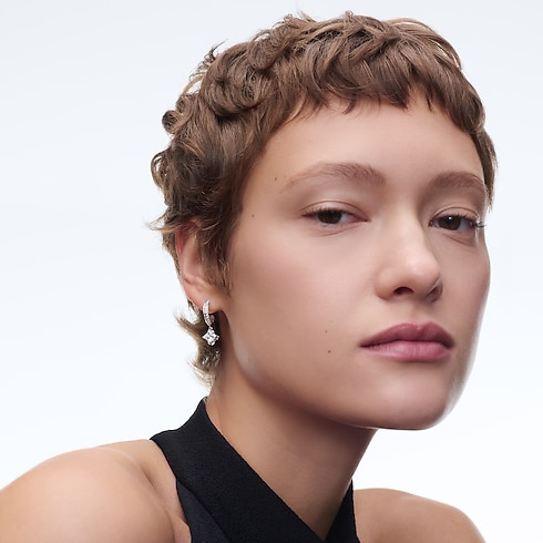 The LV Diamonds pavé hoops showcase the Maison’s exceptional jewelry savoir-faire. Cast from 18-karat white gold, these earrings feature an LV Monogram Star cut diamond, with the hoops adorned with brilliant round-cut diamonds. For a distinctive signature touch, the center stone basket is modeled after the stylized flowers of Louis Vuitton’s legendary Monogram pattern. Playful and easy to mix and match, these hoops make a memorable gift to be cherished forever. This piece is accompanied by an LV Diamonds Certificate, a unique and immutable digital record of the central diamond’s characteristics and its journey, from extraction to final setting. This secure certificate is powered by Aura Blockchain Consortium technology.