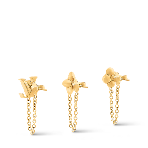 The LV Floragram earrings set reimagines a trio of classic House icons with graceful feminine elegance. Finely crafted studs in the shape of the LV Initials and two different Monogram Flowers are accented by chain details with gold-colored links. These chic, versatile earrings can be worn alone or in any combination for a creative personalized look.