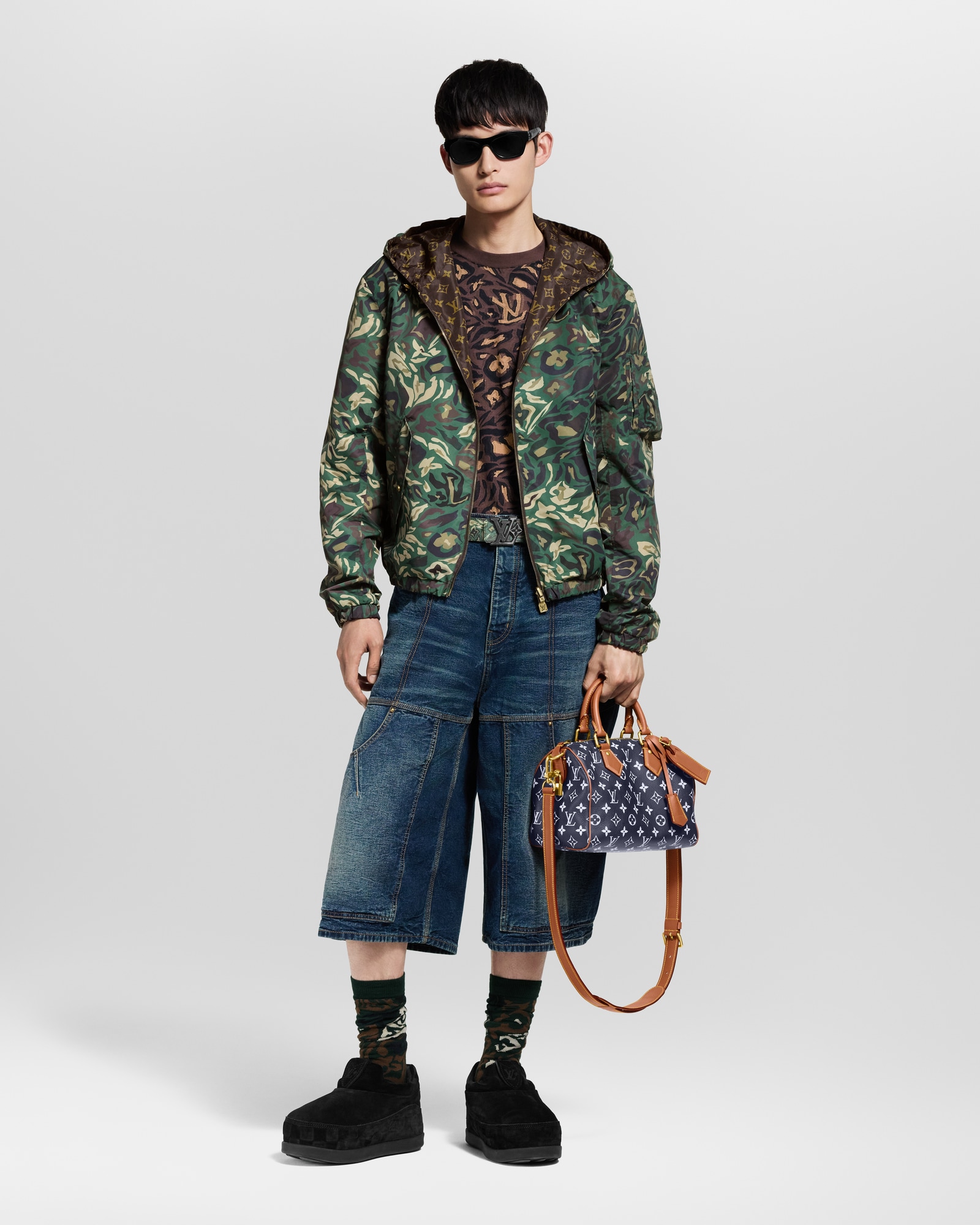 The LV Flower Camoflage 40mm Reversible Belt is a clever reinterpretation of the masculine motif long favored by outdoorsmen. The muted palette is transformed into a blend of swirled shapes and House signatures. As a sleek alternative, the reverse is crafted from black leather. The silver-toned buckle with the floral signature suits both fashion-forward options perfectly.
