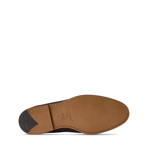 Crafted from suede calf leather, the LV Gent loafer has an exceptionally soft, supple feel, the result of both its fine material and its traditional sacchetto construction. The strap on the upper is embellished with a natural leather insert, which is embossed with the LV Initials and accented with yellow stitching, recalling the House's leather goods.