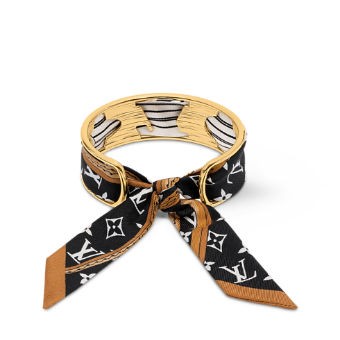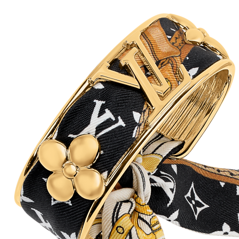 The strikingly original LV Initiales Silk bracelet combines the precious radiance of gold-toned metal with the opulence of plush silk. A finely crafted cuff integrating the House’s iconic Monogram Flowers and LV Initials is threaded with a removable silk Monogram bandeau. An eye-catching bracelet, and a unique way to wear the Louis Vuitton signature.