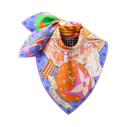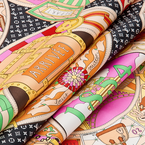 The LV Journey silk square embarks on an extraordinary adventure in the world of travel. Its intricate, playful print combines images of luggage, hot air balloons, trains, ships and airplanes with dice, clouds and the houseís signature Monogram and Damier motifs. A striking, timeless design thatís sure to make this an iconic accessory.