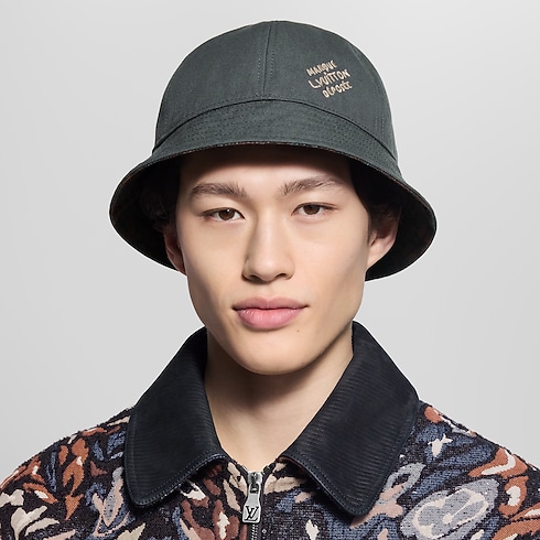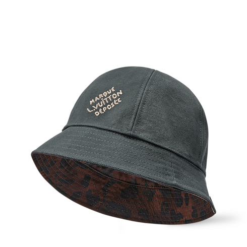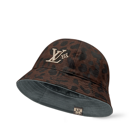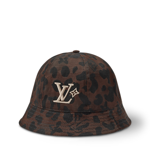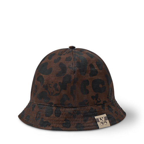 The LV Leo Reversible Bucket Hat is a lightweight style with an expressive mix of the classic and the contemporary. Made in Italy, the 100% cotton piece boasts, on one side, a brown leopard pattern and Pharrell Williams and Nigo's portraits in white, and on the other, a solid brown with the LV Flower signature.