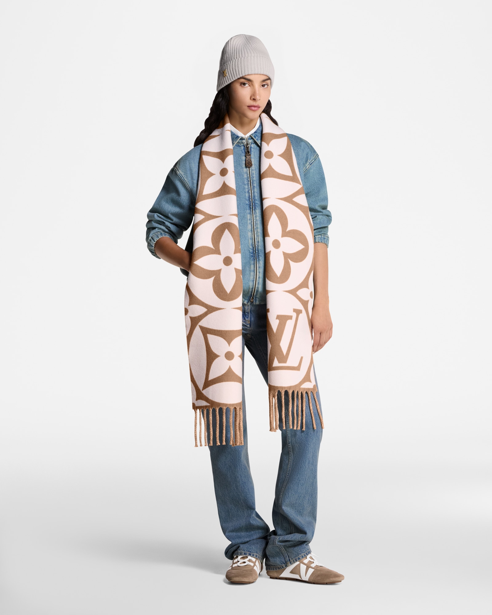 Woven from fine pure wool, the LV Medallion scarf was crafted to deliver warmth in the heart of winter. A bold pattern of giant LV Initials and Monogram Flowers gives it an instantly recognizable signature look, with extra-long fringe for a luxurious finish. An eye-catching accessory, and a coddling companion on cold windy days.