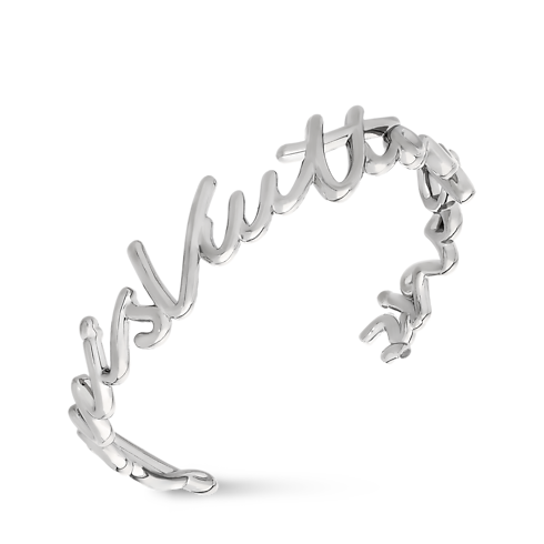 The casual-chic LV Script bracelet was inspired by a Louis Vuitton signature in a sleek hand-written style, first seen at the Spring-Summer 2025 runway show. Its creative design takes the form of an open band spelling out the House’s name in bright palladium-colored metal. This precious, comfortable bracelet is easy to wear for everyday or special occasions.