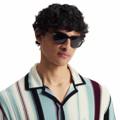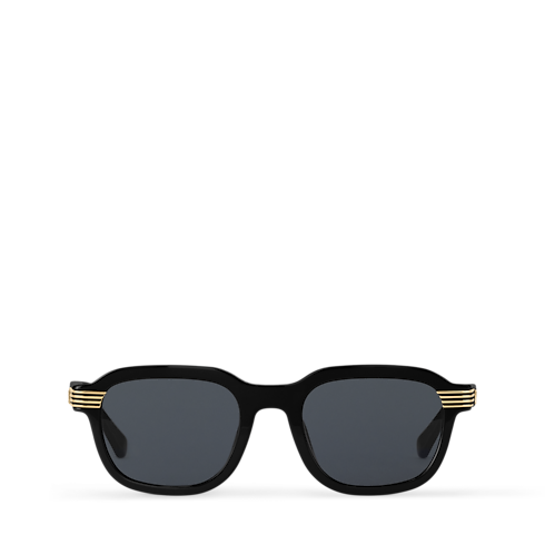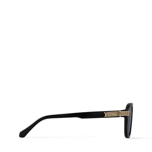 The LV Slide Square Round sunglasses are at once angular and curved, uniting quality craftsmanship with glamorous detailing. A glossy acetate silhouette is embellished with four gold-toned metal stripes, stretching from the side of the brow to midway down the temples, culminating in an LV signature. The effect is mysterious and soulful.