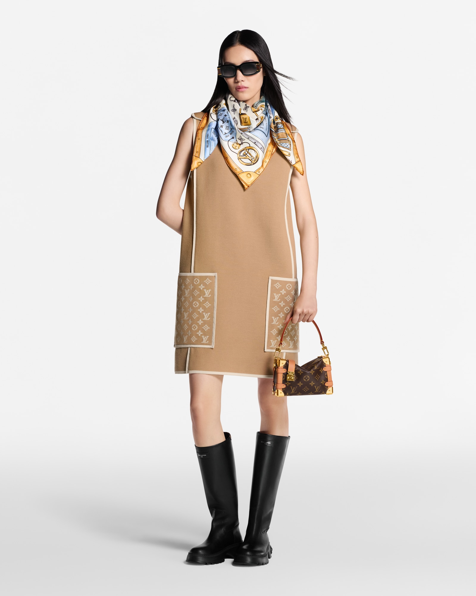 The all-silk LV Tool Box square offers a unique blend of practicality and sophistication. Its richly detailed pattern features an array of tools and components evoking the House’s trunk-making heritage, mixed with Louis Vuitton icons like Monogram luggage tags and padlocks. An ode to craftsmanship and ingenuity, it brings a touch of glamorous refinement to any outfit.