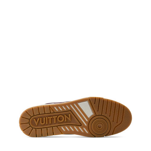 This refined interpretation of the LV Trainer sneaker combines grained and aged calf leather, fusing vintage-style materials with a contemporary design. This iconic model, which was inspired by classic basketball sneakers, is notable for its elaborately constructed upper, which features multiple House signatures, and its technical rubber outsole with Monogram Flowers.