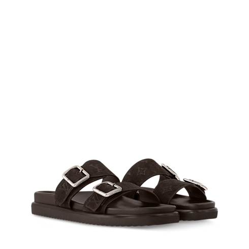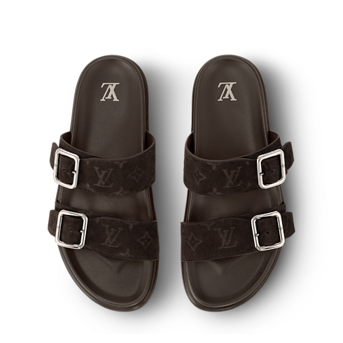The LV Venice mule comes in velvety suede calf leather debossed with the Louis Vuitton Monogram pattern. This casual-chic style is distinguished by its two adjustable straps with rectangular, gold-toned buckles. It is finished with a padded anatomic footbed and a lightweight micro outsole for optimum comfort.