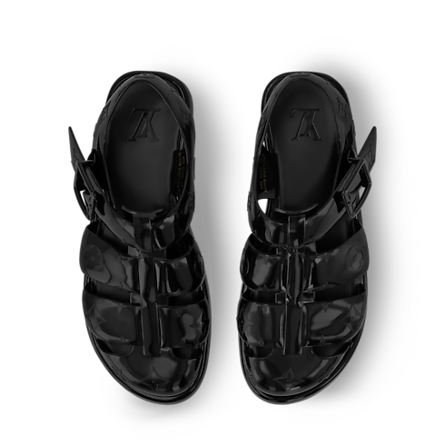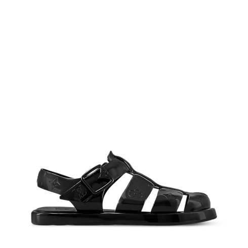 The LV Venice sandal is a fisherman-style model in rubber decorated with the House's signature Monogram pattern. It features a single strap, which is adjusted with a Monogram Flower buckle. This model has a padded insole and an extremely lightweight rubber outsole, which make it particularly comfortable to wear.