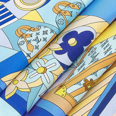 The all-silk LV Wonderland square offers a striking combination of contemporary artistic vision and timeless heritage touches. Its imaginative design features the famous LV Initials surrounded by historic Louis Vuitton trunks and bags, bouquets of Monogram Flowers and whimsical mechanical birds. The entire pattern is tilted in the colorful border for a dynamic, futuristic effect.