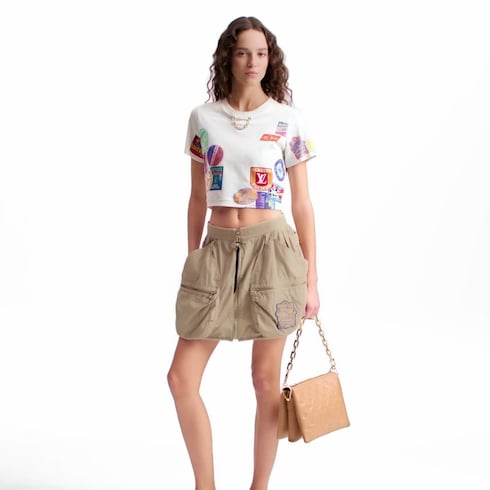 This top is printed all over with a delicate Mahina Monogram motif, which is overlaid with colorful clusters of Louis Vuitton travel stamps for a playful retro accent. It is cut from breathable cotton jersey in a chic cropped shape for casual styling, while an LV chain detail adds a final House touch to the neckline.