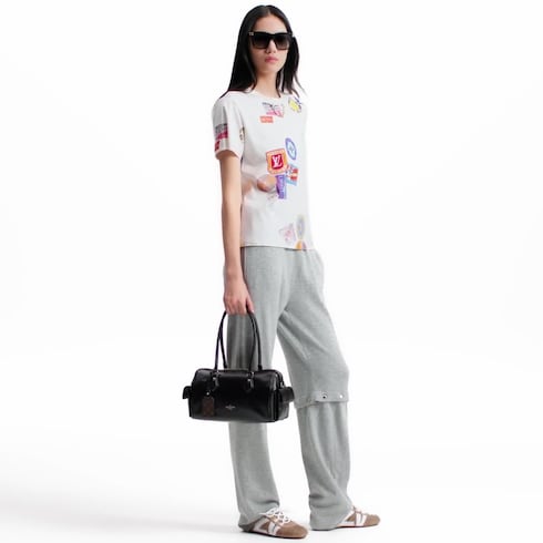 A play of spirited signatures from the Flight Mode collection uplift this T-shirt with an adventurous spirit. It is cut from soft cotton jersey in a delicate allover Mahina Monogram motif, while prints of retro-style Louis Vuitton travel patches introduce a vibrant pop of color, and the crew neckline is trimmed with an LV chain detail.