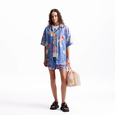 This shirt has easy summer appeal in a short-sleeved straight shape finished with a button front, a club collar and a patch pocket. It is cut from soft, fluid silk twill in a delicate allover print of the Mahina Monogram motif, which is overlaid with clusters of colorful Louis Vuitton travel patches from the Flight Mode collection.