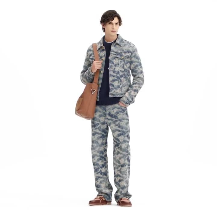 This richly worked denim trucker jacket takes inspiration from the British countryside and its famous rolling mists and fog. A sophisticated Foggy Monogram jacquard adorns the indigo fabric, with bleached-effect signatures interspersed with clouds, woven with a tapestry-like effect. A VVN-colored leather Damier jacqueron adds a chic finishing touch. Pair with matching skate pants for a standout set.