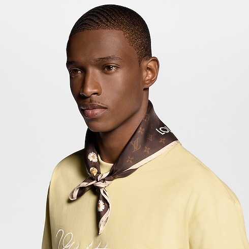 Crafted from 100% pure silk, this Monogram Flower bandana is an elegant accessory that adapts to everyday wear. Made in Italy, it features a transversal print combining Monogram flowers with organic floral motifs. The House's signature color bring depth and warmth to the design.