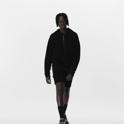 These shorts in soft French terry are ideal for relaxing after a trip to the beach. Both easy and refined, they have an adjustable drawstring waist, while the black cotton-blend fabric is distinguished with an allover debossed tonal Monogram signature. They can be worn as a set with a matching hoodie.