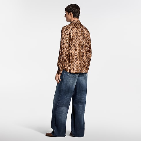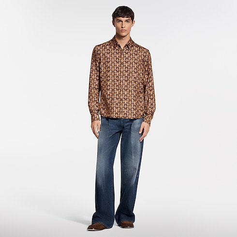 This fluid shirt is crafted from pure organic silk in rich brown Louis Vuitton heritage tones. It features a graphic allover Monogram Overlap motif from the Spring-Summer 2026 show and is finished with lustrous tiger’s eye quartz-like buttons. This luxurious piece brings an elevated signature accent to a look.