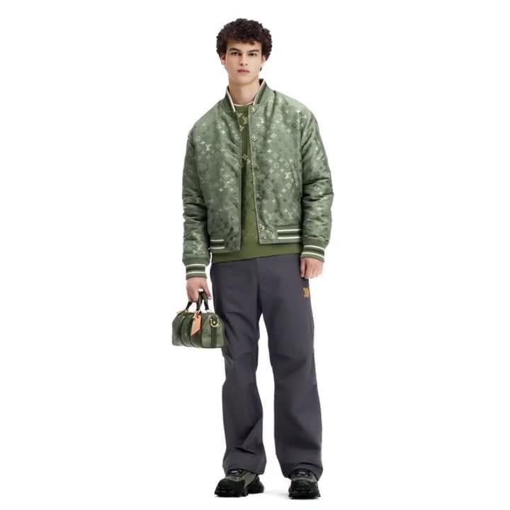 This long-sleeved pullover in earthy green tones is adorned with a graphic allover Monogram Surplus jacquard recalling camouflage motifs. The dappled green signatures against a khaki base are worked into an exceptionally soft wool-cashmere knit. This cozy piece can be easily layered into any wintery look.