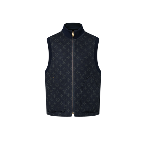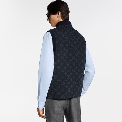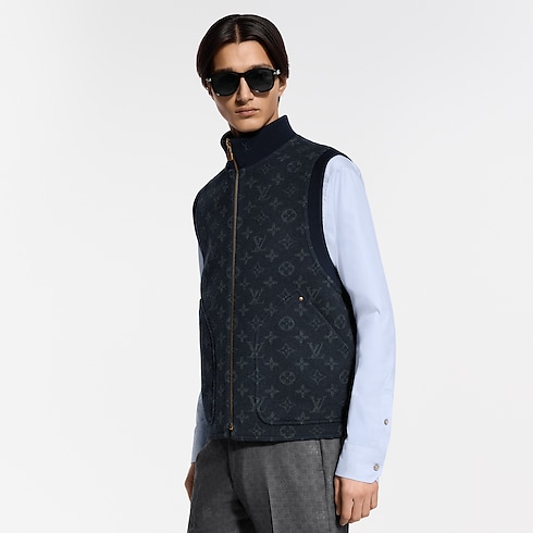 This reversible navy blue gilet is a perfect midseason layer that can be styled over a shirt or pullover or under a jacket. Crafted from double-face fabric in a warm and luxurious blend of wool, cashmere and silk, it has a timeless plain side signed with discreet rhinestones on the chest, LV Flower rivets on the pockets and a leather patch on the back, while a tonal jacquard Monogram motif lends a graphic accent to the reverse.