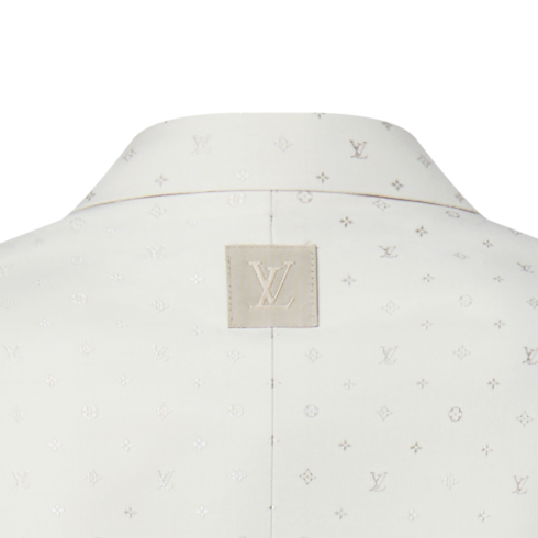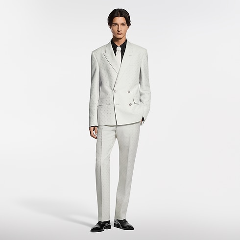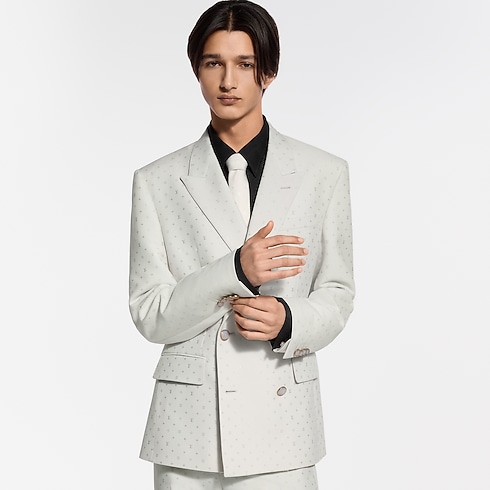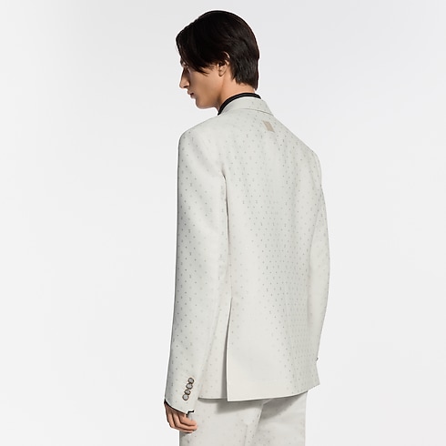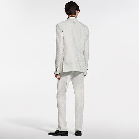 This chic double-breasted evening jacket in a pale ivory hue stands out from the crowd for summery celebrations. It has a tone-on-tone jacquard Spaced Mini Monogram motif expressed in a subtle play of matte and lustrous textures thanks to the fabric's luxurious silk and mohair content. The sleek silhouette—an icon of dandy wardrobe style—makes a sharp suit with matching pants.