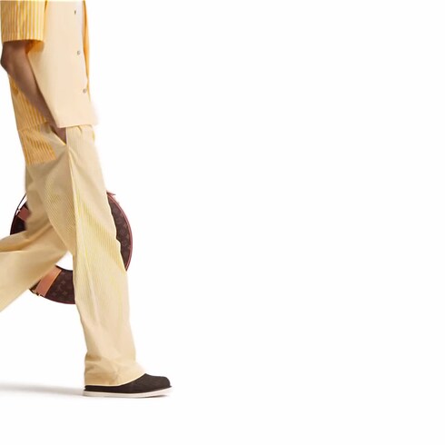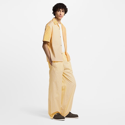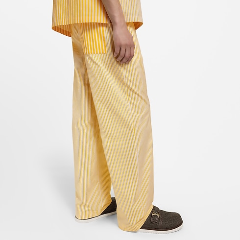These summery drawstring pants, crafted from light cotton, are adorned with vibrant yellow stripes printed on a Monogram jacquard base. Wider stripes add an eye-catching patchwork accent to the rear pocket, which is signed with a playful rubber LV Flower patch. A matching shirt makes a fresh and graphic set.