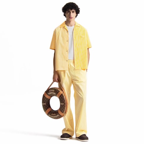 This short-sleeved shirt is perfect for a sunny summer’s day with its open collar and vibrant yellow stripes printed on a Monogram jacquard base. Narrower stripes on the front right create an eye-catching patchwork effect, while a rubber LV Flower patch accents the chest pocket. Matching drawstring pants make a fresh and graphic set.