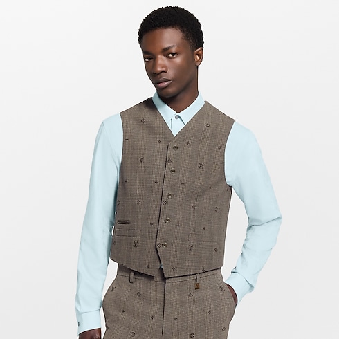 This elegant vest is tailored in a fine wool jacquard inspired by British sartorial traditions. It features a Monogram Prince of Wales pattern in subtle brown tones, adorned with a spaced Monogram all over. Perfect for this collection’s dandy on a visit to the British countryside, it can be worn as part of a three-piece suit.