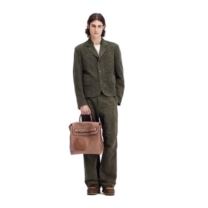 These denim pants are conceived with a waxed treatment for changeable weather and have a relaxed fit with knee darts for comfort and ease. An allover Monogram Surplus print adorns the dark khaki base, while a leather Damier jacqueron signs the back. Pair with a matching tailored jacket for a rugged twist on urban style.