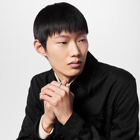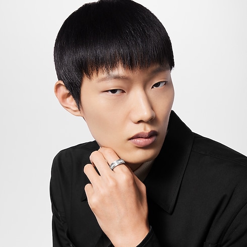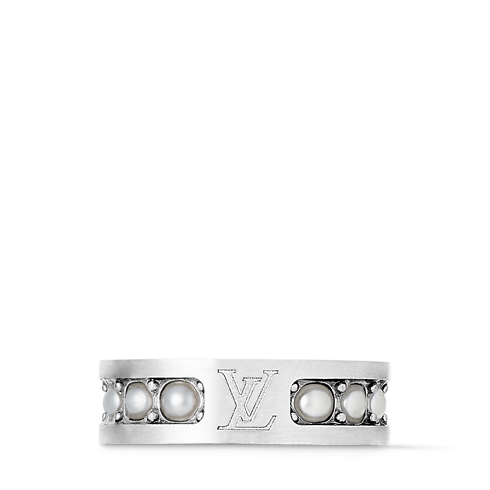 Meticulously crafted and engraved, the Pearls Ring is made from silver-tone metal with a masculine, brushed finish. Pearl-like white resin beads are inset in this substantial piece, surrounding the central etched LV Initials signature. Striking on its own, the ring can also be worn along with the matching ear cuff, earrings and necklace for a statement effect.