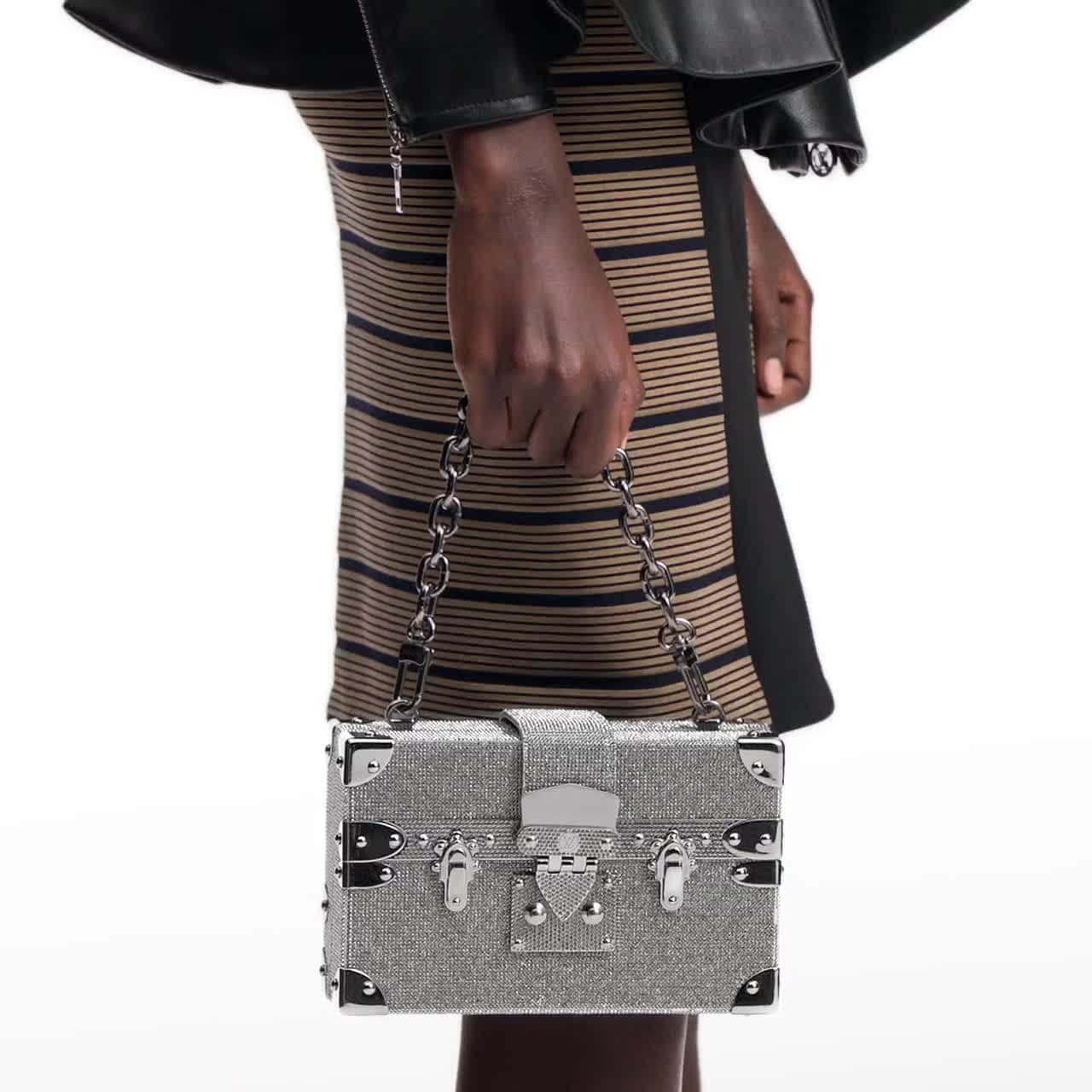 Introducing the LV Sparkle Petite Malle, a celebratory update of the iconic handbag that debuted in 2014. This collector’s piece is encrusted with over 29,000 crystals to create a brilliant finish that recalls archival runway designs. Honoring the House’s heritage, it is finished with trunk-inspired corners and includes a detachable chain that can also be worn as a necklace. Note the limited-edition engraved plaque on the inside.