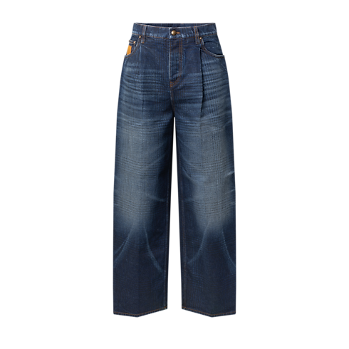 These wide-leg pants from the Spring-Summer 2026 show playfully twist sartorial codes, with a glen check, inspired by heritage tweeds, printed onto the indigo denim. The organic cotton fabric has a washed vintage finish, while the pleated front creates an elegant silhouette. Leather signature details accent the ticket pocket and belt. A matching blouson makes a total look.