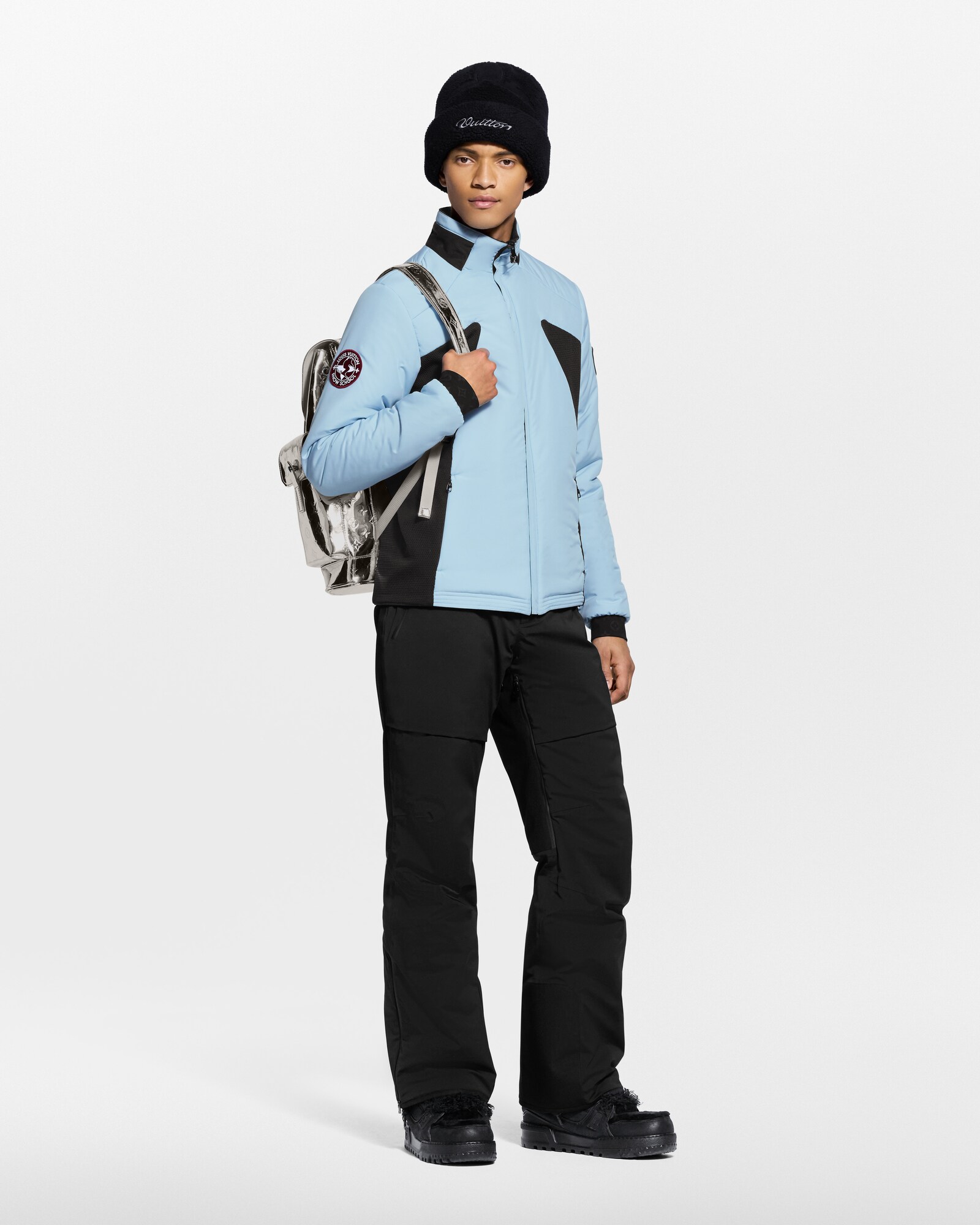 This reversible, lightly padded blouson can be worn alone or under a shell ski jacket. The timeless dark gray exterior is elevated with tone-on-tone Monogram jersey side panels, while a sky blue side with embroidered ski-themed signature patches on the arms adds a fresh color accent to a look. A waterproof zipper and a fleece-lined collar ensure comfort while four zippered pockets each side provide enhanced functionality.