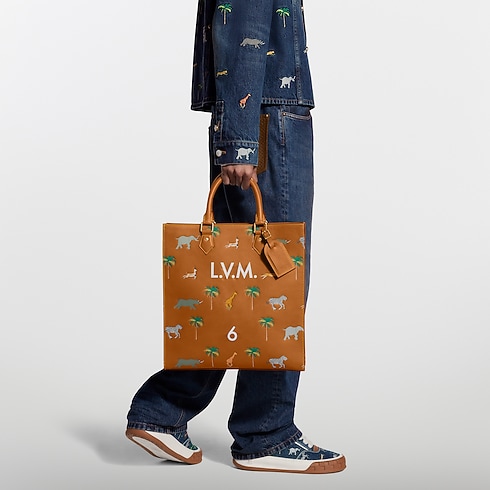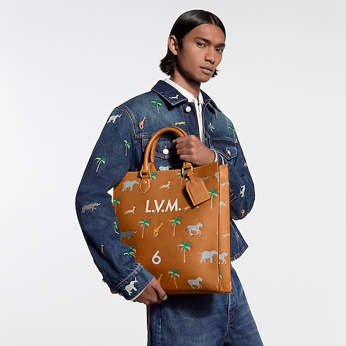 The spacious Sac Plat is made from naturally tanned calf leather with a sfumato finish, animated by wild animals racing across the bag in a motif inspired by The Darjeeling Limited film. It features the iconic screen-printed number from the film alongside L.V.M. initials and is lined in LV Blason textile.