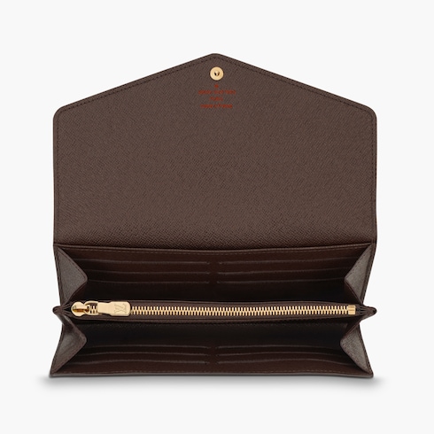 The Sarah wallet comes in Louis Vuitton's historic Damier Ebene canvas, complemented by a grained-leather lining. This classic wallet combines a feminine look with a highly functional design, including two roomy compartments, a zipped coin pocket and numerous card slots. Its envelope-style flap is sealed with an engraved, gold-tone press-stud.