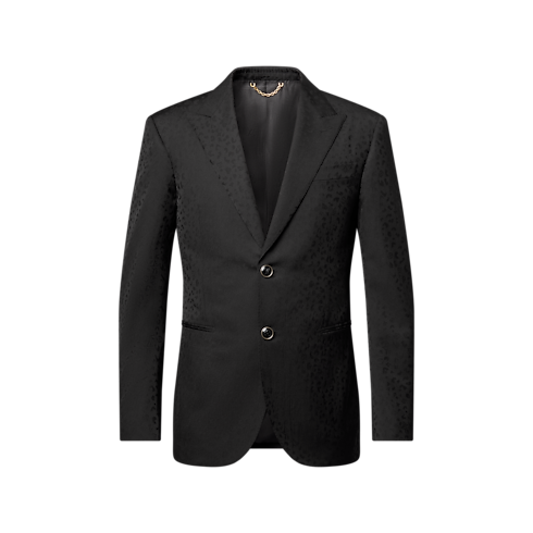 This sleek, black, single-breasted evening jacket is richly embellished with this collection’s LV Cheetah motif. Interpreted as a rich satin jacquard made from responsibly-sourced wool, the graphic feline pattern integrates discreet Monogram signatures in a rich interplay of matte and lustrous textures. Matching cigarette pants make a sharp silhouette that stands out from the crowd.
