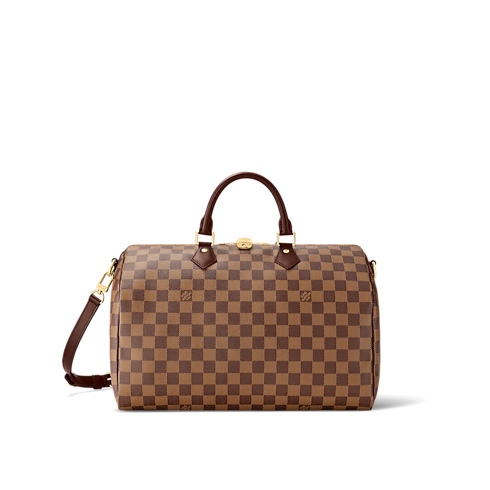 The Speedy Bandoulière 20 city bag is now offered in classic Damier Ebene canvas. Trimmed with chocolate-brown leather and fitted with a beige textile strap, this sporty model is designed for active lifestyles. It accessorizes any silhouette with its instantly recognizable shape, engraved gold-tone padlock and iconic, rolled Toron handles.