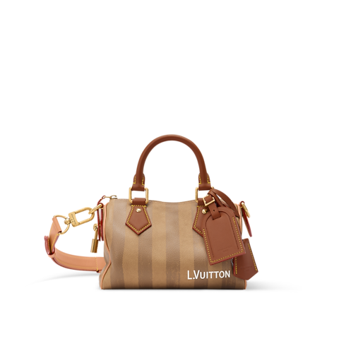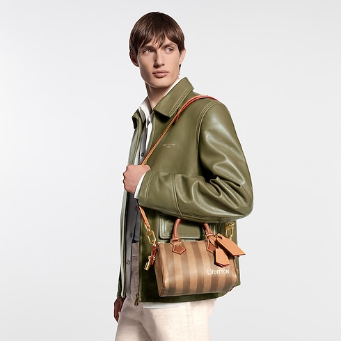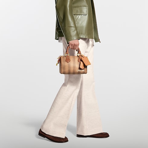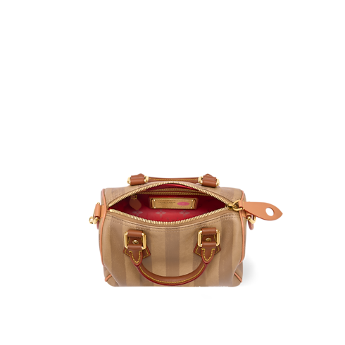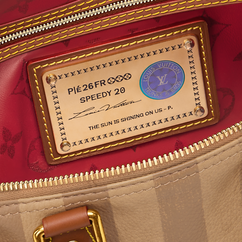 With stripes printed on calfskin leather, the Speedy P9 Bandoulière 20 evokes one of the original patterns of Louis Vuitton trunks from the late 19th century. The washed-out print underscores the House’s artisanal expertise while reinforcing its historic reference. Inside, a red Monogram lining in printed goatskin adds a bold, luxurious touch.