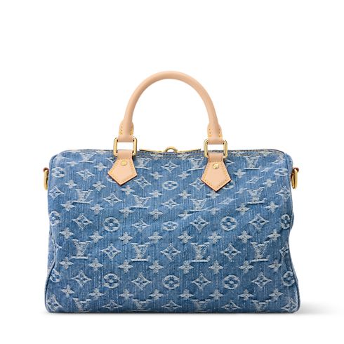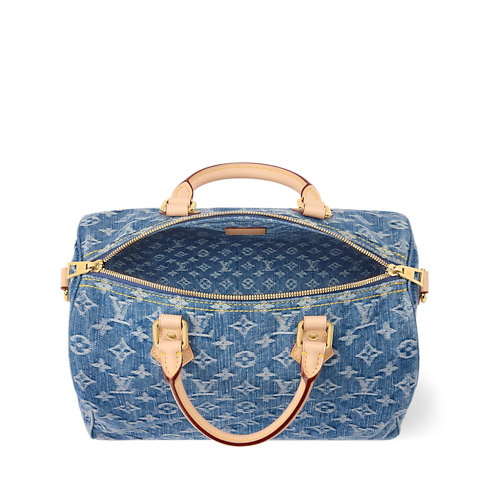 This edition of the Speedy Soft 30 is updated in Blue Denim, adding a contemporary spin to the classic design. Patterned with the House's iconic Monogram, it is trimmed with a contrasting leather handle, removable strap and a decorative keybell embossed with the Louis Vuitton signature. It is generously sized to fit the essentials, plus a tablet and book, making it ideal for weekends or commutes.