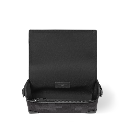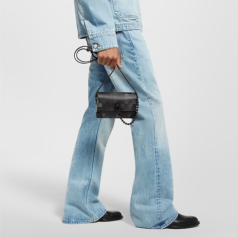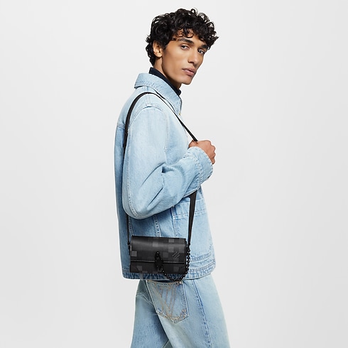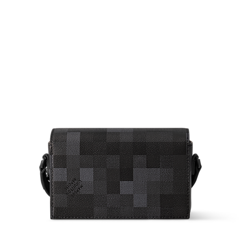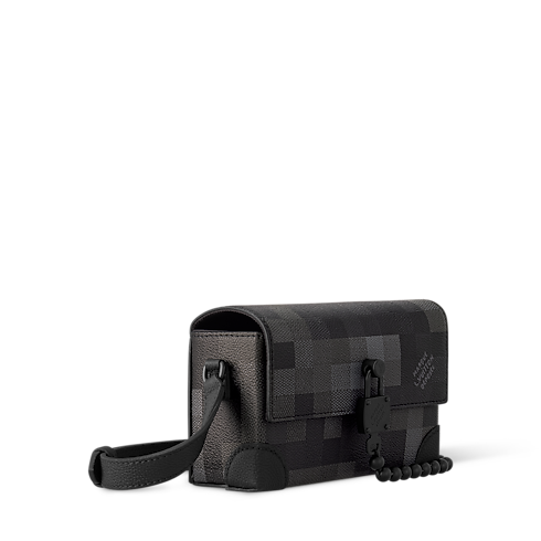 Now accessorized with a square padlock attached to a ball chain, the Steamer Wearable Wallet in Damoflage Black coated canvas incarnates Pharrell Williams’ vision of masculine sophistication. The pixelated treatment of the iconic Damier Graphite motif brings modernity to the bag. The strap adjusts for shoulder and cross-body wear. Appearance may vary slightly from photos, depending on the placement of the pattern.