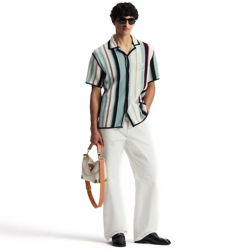 This colorful short-sleeved shirt stands out with its vertical crochet stripes in organic cotton. Satiny embroidered signatures embellish the chest and back while mother-of-pearl effect buttons adorn the fastening. Elegant and relaxed with a loose and breathable knit, this graphic piece, which has matching shorts, is perfect for lounging on the deck of a cruise ship.