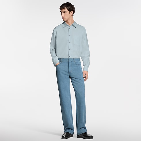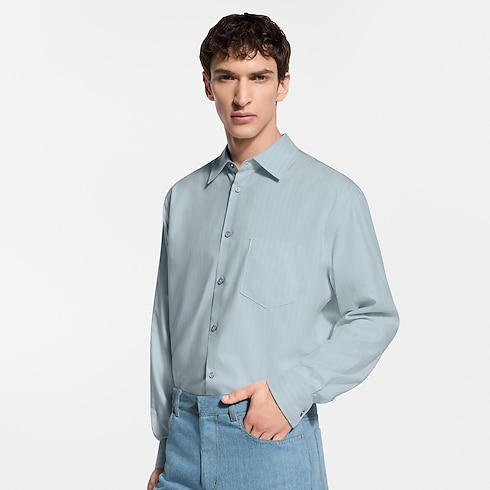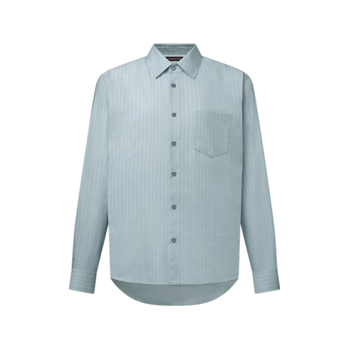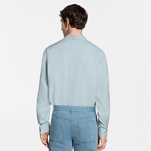 A luxurious blend of silk, cotton and cashmere gives this pale blue striped shirt a light and airy touch. This versatile piece can be styled up or down, layered with other items or even tied casually around the waist. LV stitching signs the first button, while a VVN leather tab behind the collar pays homage to the House’s travel origins.