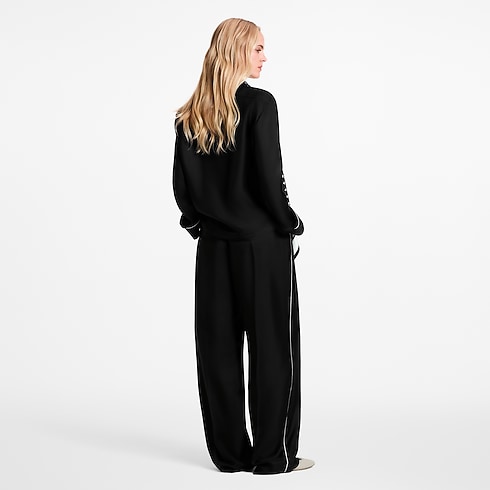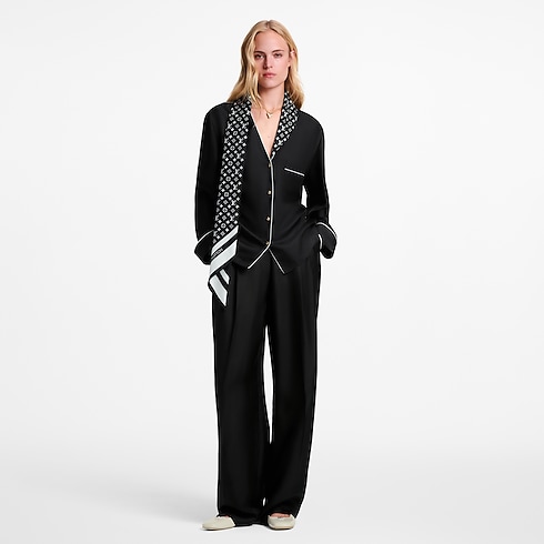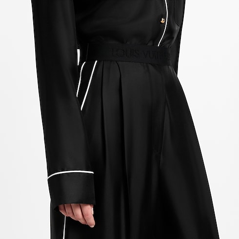 These pants have a modern, dressy feel in this season’s go-to silhouette. They are cut from soft silk twill in a fluid wide-leg shape tailored with sharp pleats and creases on the legs and welt pockets at the back, while the casual elasticized waistband is discreetly detailed with a Louis Vuitton Paris signature.