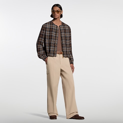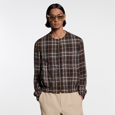 This light zippered blouson draws on the Spring-Summer 2026 show’s Indian Dandy inspiration with a sartorial plaid in rich brown tones and gold-toned Louis Vuitton Paris embroidery on the chest. The cropped silhouette with a ribbed finish to the cuffs and waist develops the iconic collarless jacket introduced by Pharrell Williams, bringing a relaxed and modern vibe to everyday looks.