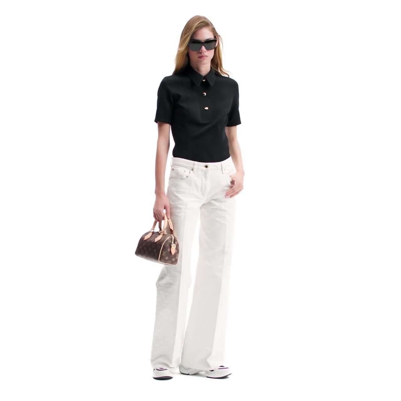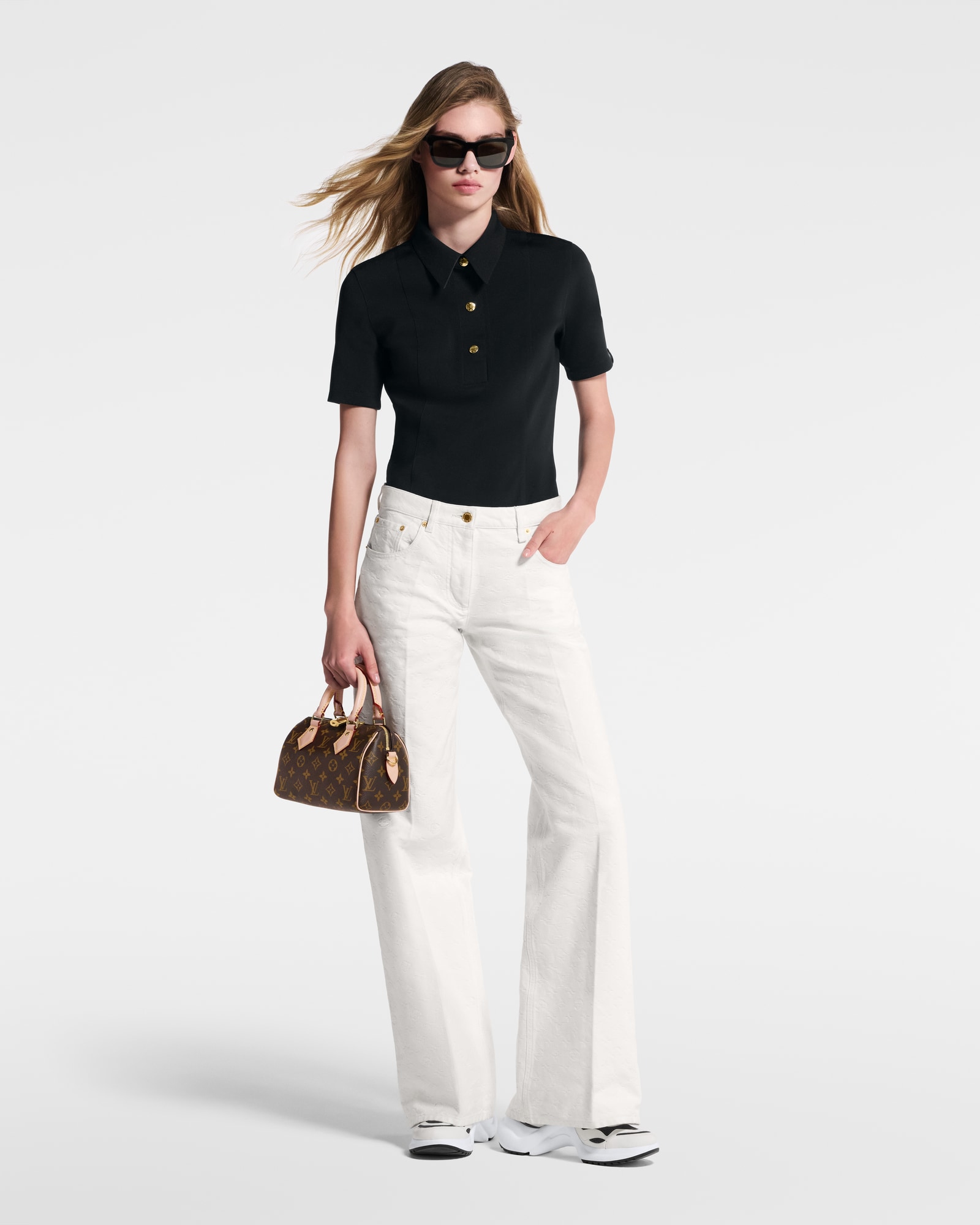 This classic polo top is revisited in the House’s flexible technical jersey for a modern, sporty look. It is cut in a chic fitted shape with a smart collar and golden snap buttons at the neckline. A Monogram Flower tab adds a subtle signature touch to the left sleeve.